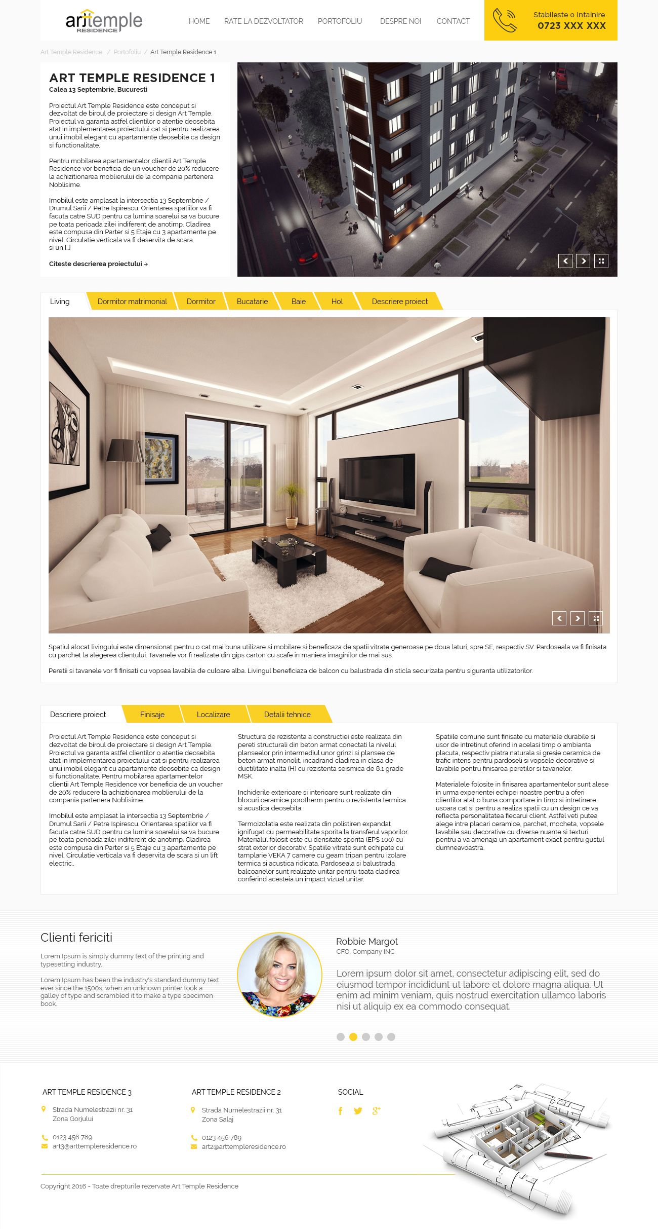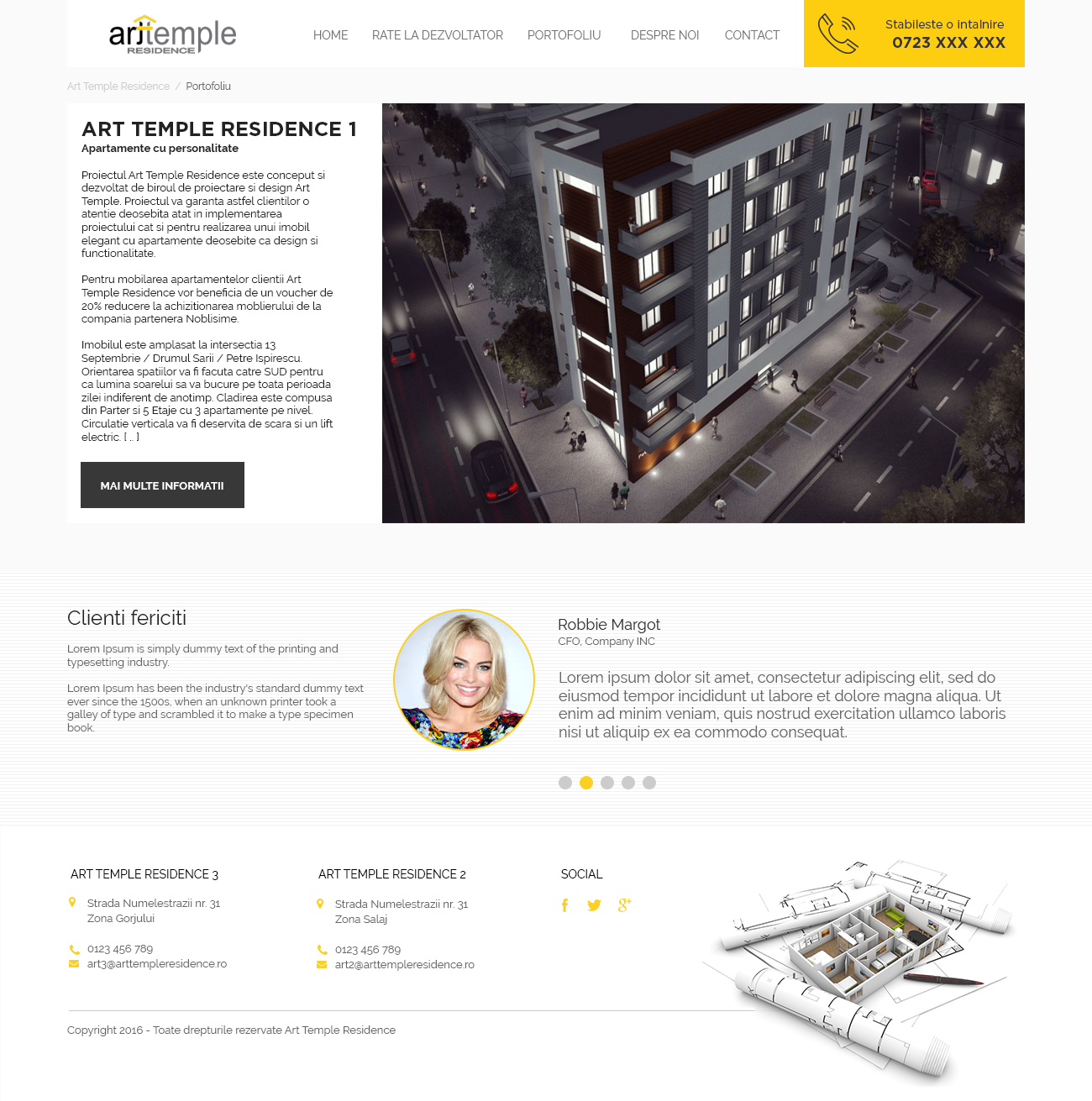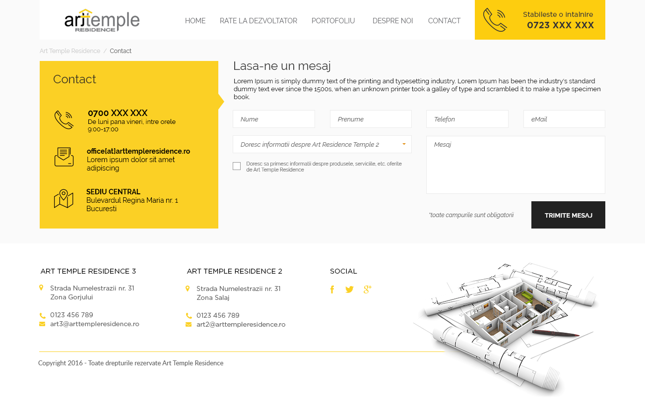 Biroul de proiectare si design Art Temple a conceput si dezvoltat proiectul Art Temple Residence, garantand astfel clientilor o atentie deosebita atat in implementarea proiectului cat si pentru realizarea acestuia. Proiectele pot lua forma unor locuinte individuale sau colective, design de mobilier, constructii publice si design interior.