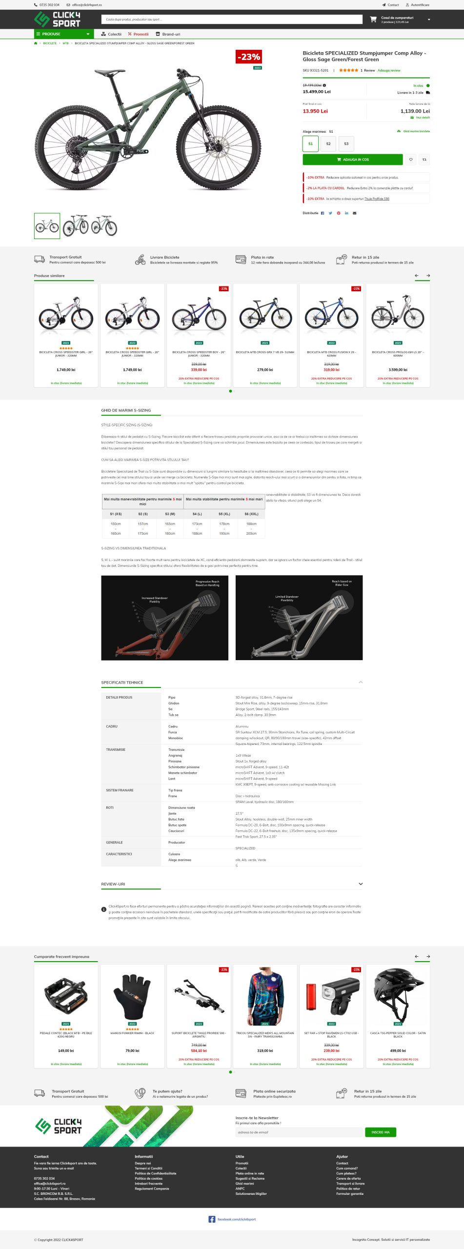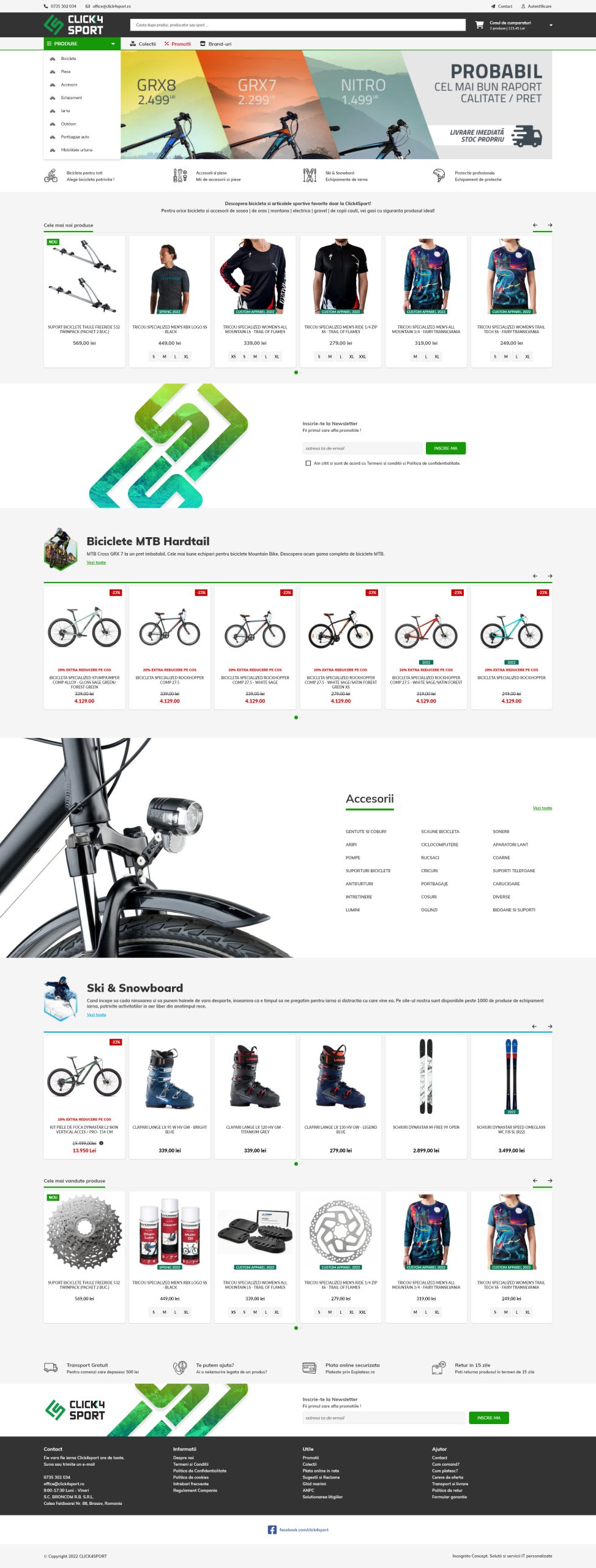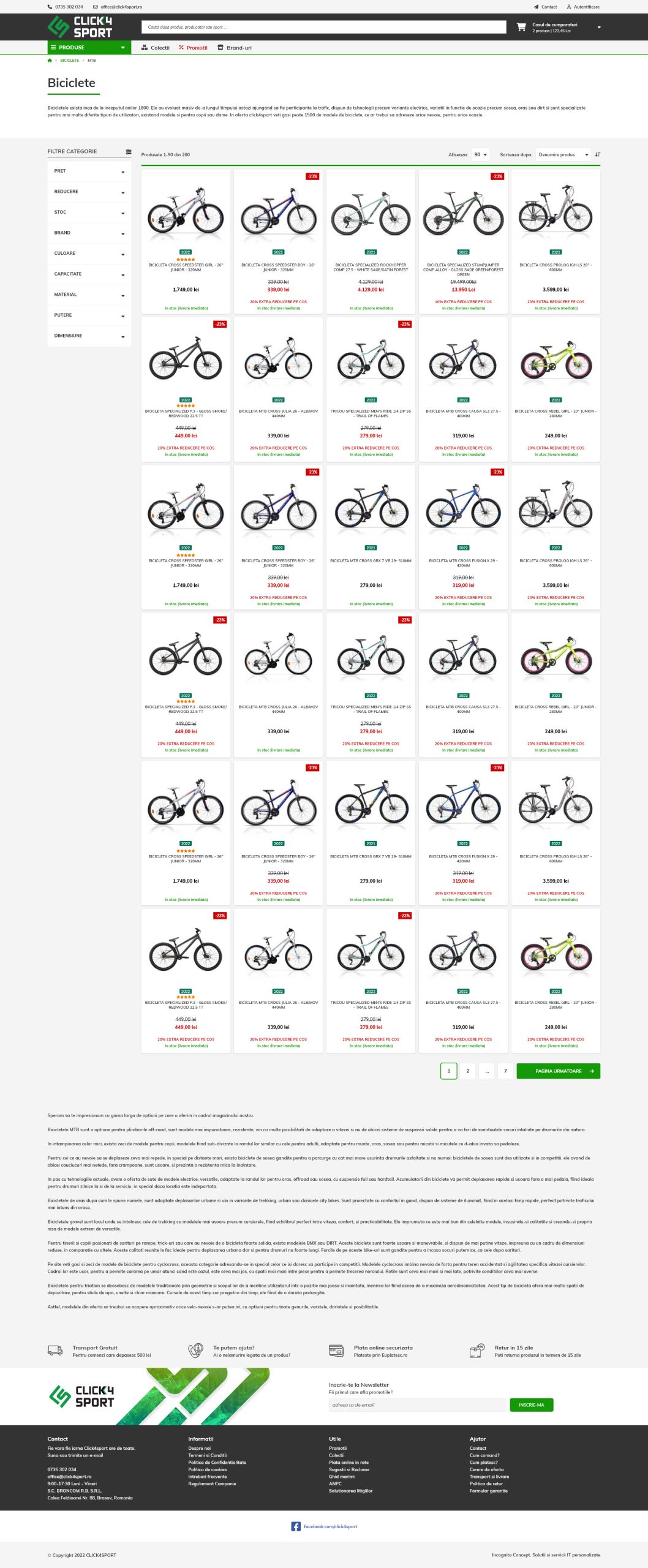 Oricare ar fi nevoile tale in materie de biciclete, la Click4Sport vei gasi cu siguranta tipul perfect de bicicleta, impreuna cu accesoriile potrivite pentru a-ti face de neuitat viitoarele calatorii. Compania comercializeaza biciclete MTB, de oras, de dama, de copii, etc. ce iti vor fi alaturi pentru a sari pe dealuri, sa urci pe munti, sa strabati orase si sa te bucuri de hobby-ul tau, ciclismul.