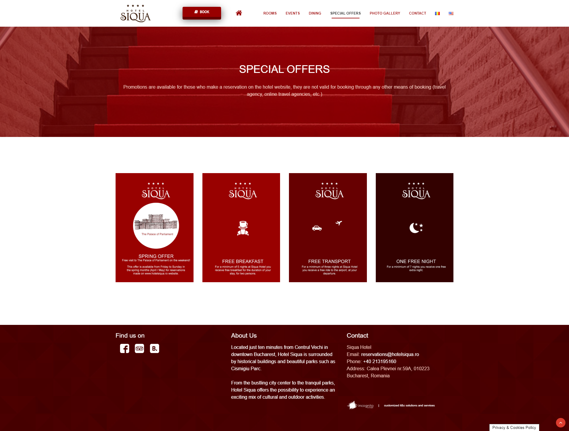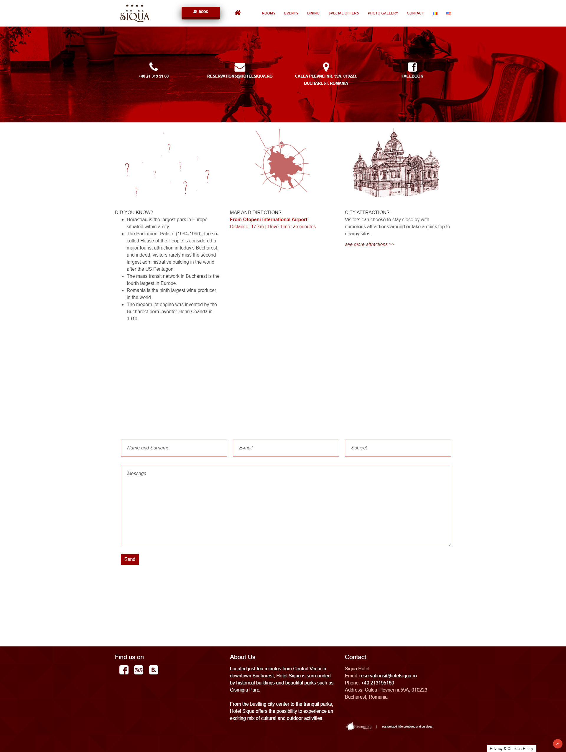 Fiind situat la doar zece minute de Centrul Vechi in centrul Bucurestiului, Hotelul Siqua este inconjurat de cladiri istorice si parcuri frumoase, precum Parcul Cismigiu. Hotelul este dotat cu o sala de bal, Amarillis, decorata elegant cu candelabre de cristal venetiene ce ofera un spatiu unic si personalizabil pentru evenimentul tau special. De la camere confortabile pana la apartamente spatioase, si pana la sali de conferinte echipate pentru intalniri de afaceri, oaspetii acestora vor gasi exact ceea ce cauta de la un hotel de 4 stele din Bucuresti.