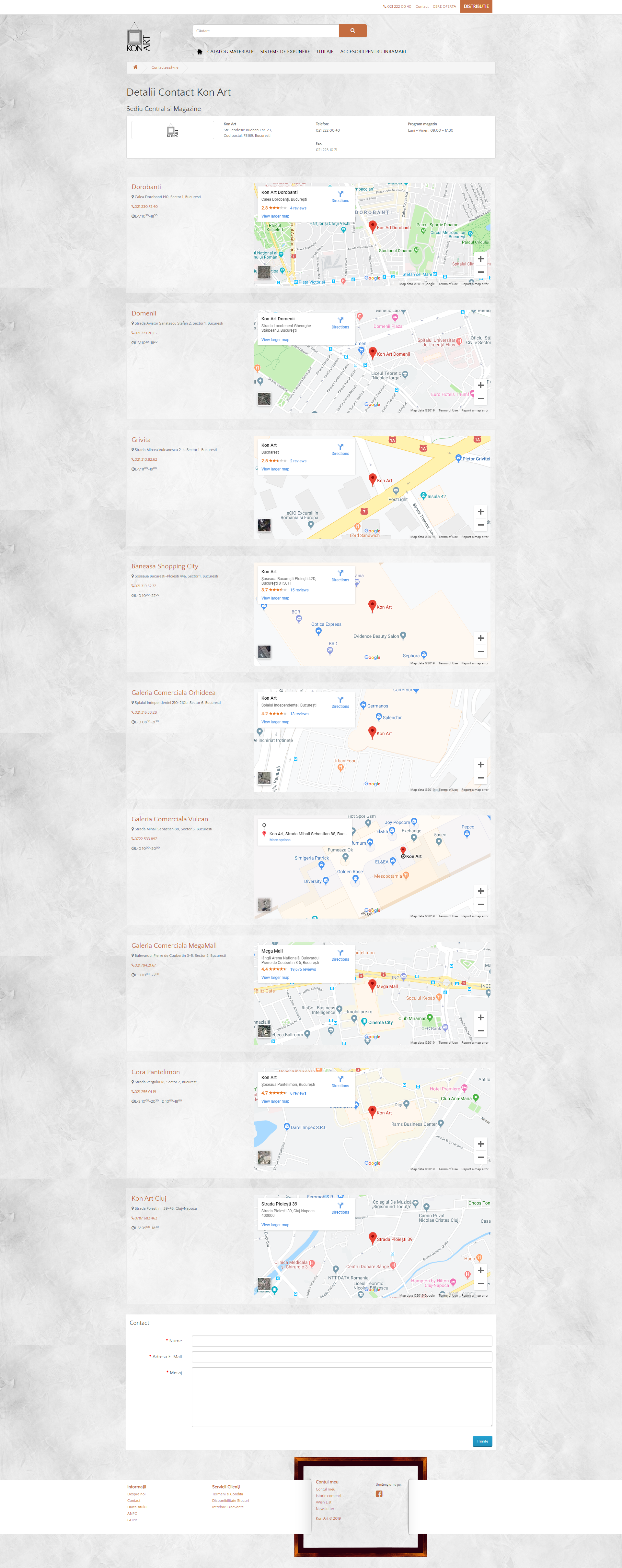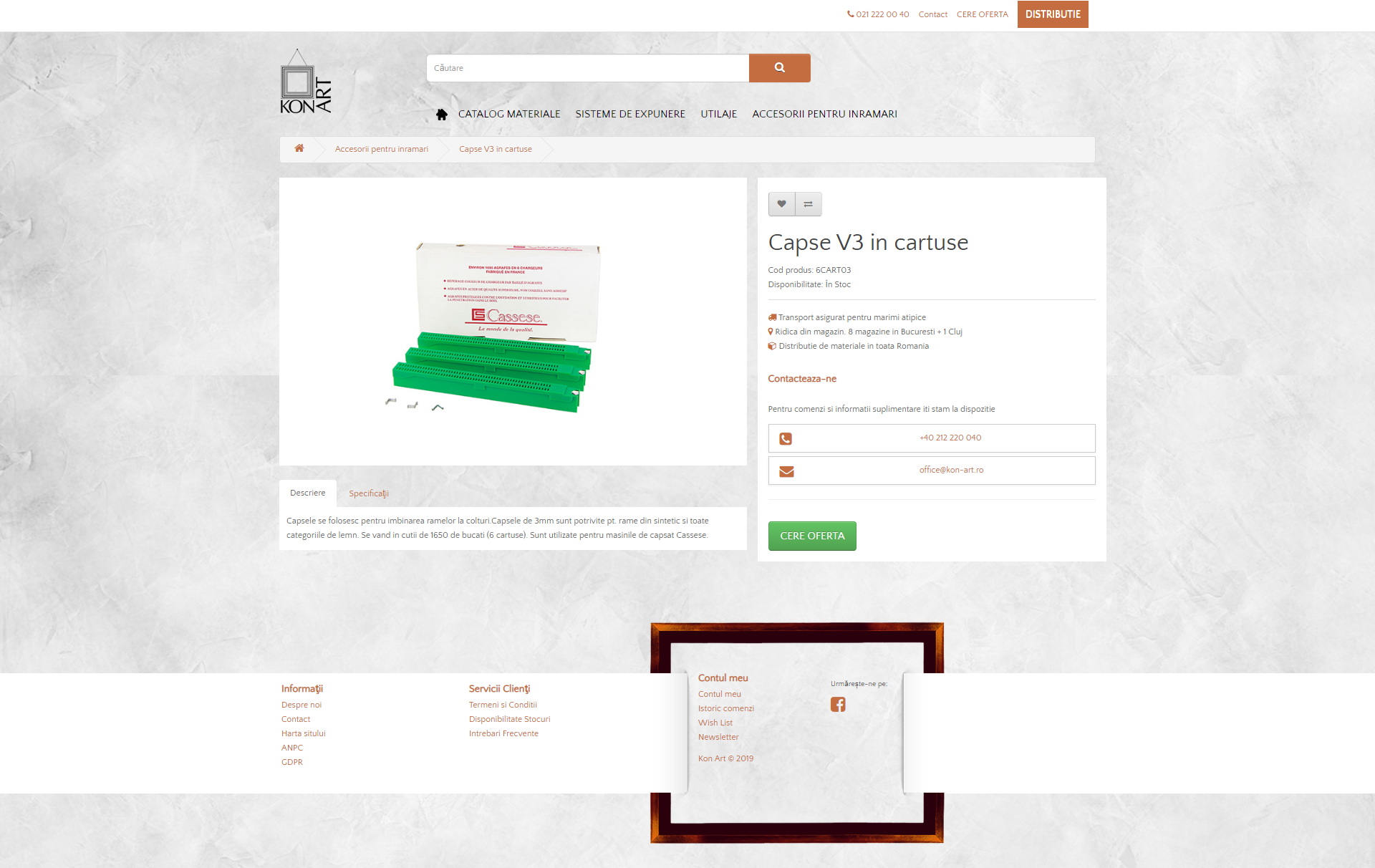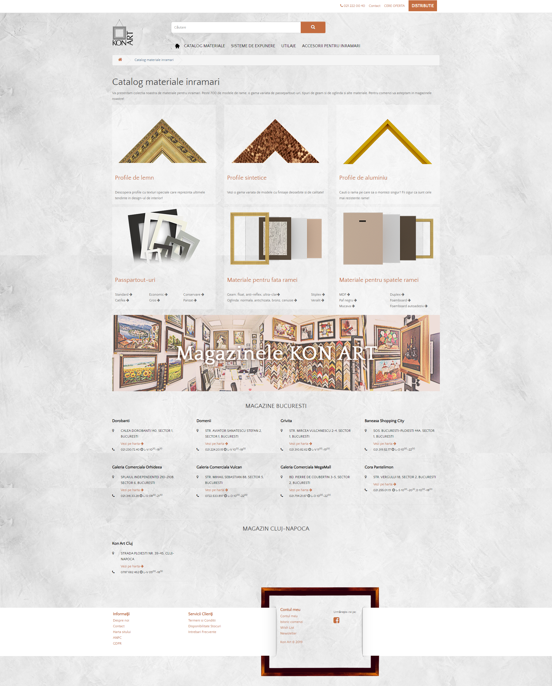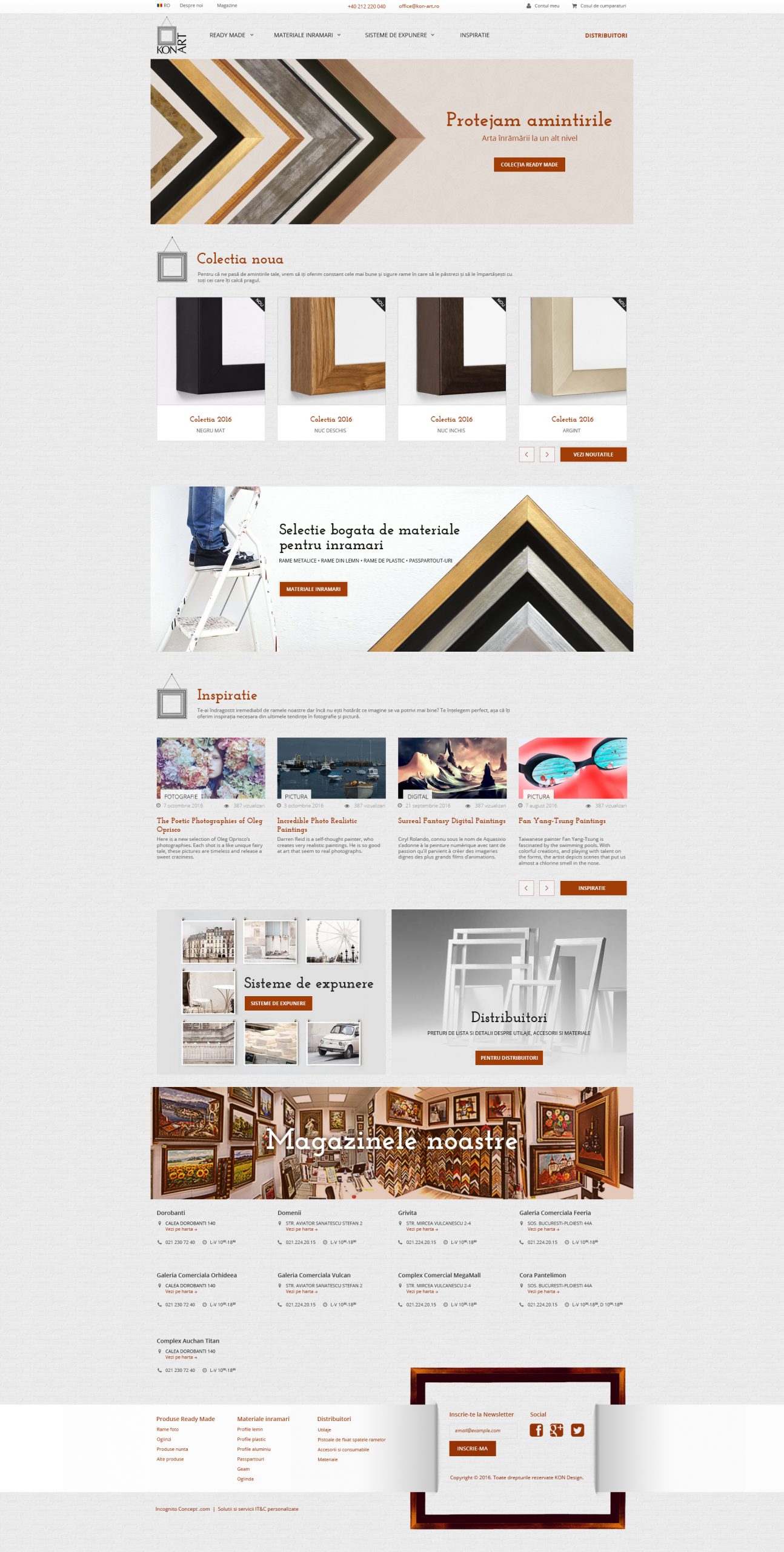 Cu o experienta de peste douazeci de ani in colaborarea cu pictori, galerii, muzee, colectionari, designeri, arhitecti si alti clienti care cauta rame frumoase si potrivite pentru lucrarile lor, Kon-Art ofera cea mai variata colectie de rame si passepartout-uri din Romania. In plus, veti putea beneficia de asistenta tehnica si estetica pentru gasirea celei mai bune solutii de inramare.