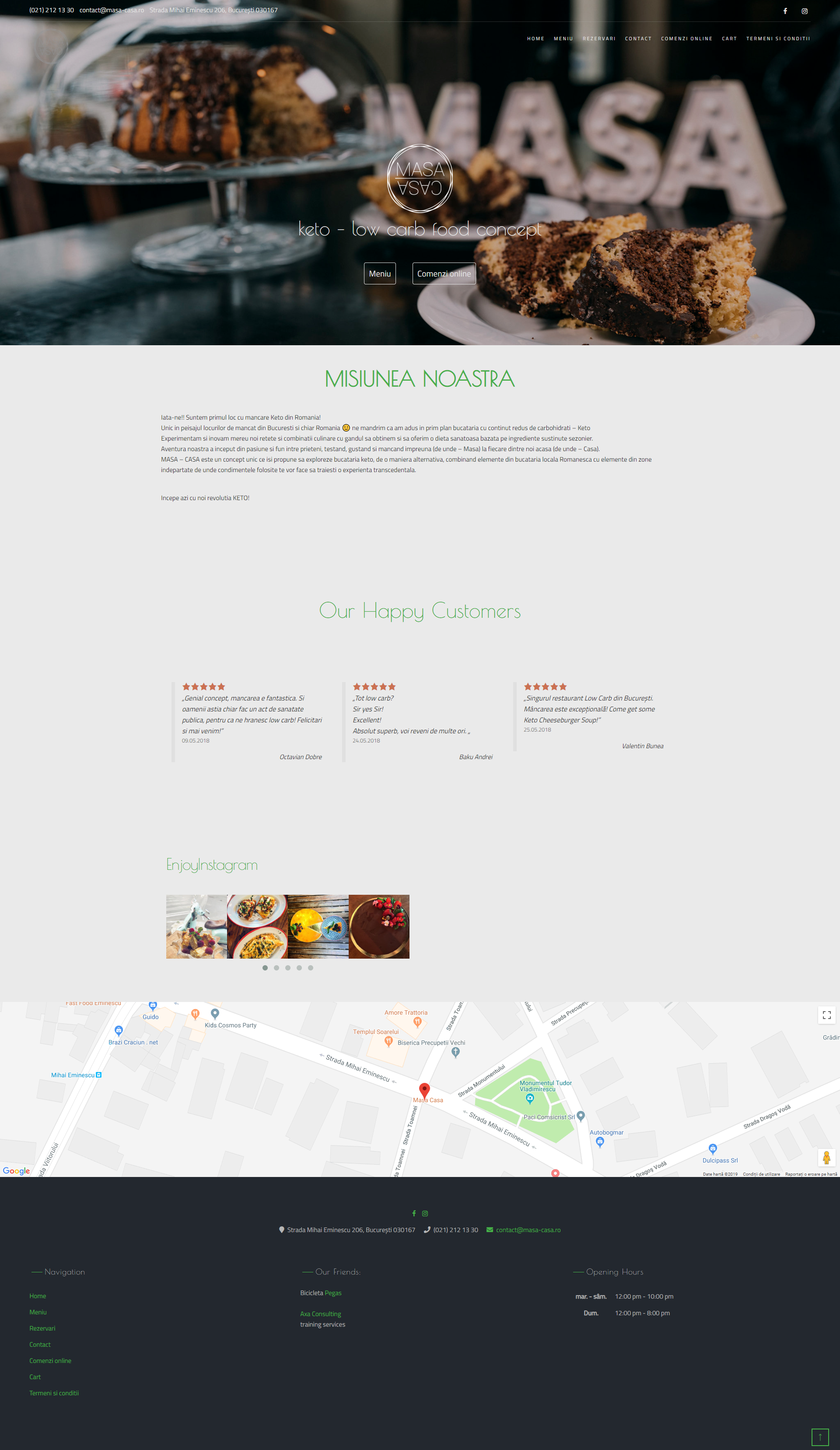 MASA-CASA este primul loc cu mancare Keto din Romania. Fiind un concept unic ce isi propune sa exploreze bucataria keto, de o maniera alternativa, combinand elemente din bucataria locala Romanesca cu elemente din zone indepartate, te va face sa traiesti o experienta transcedentala. Acestia experimenteaza si inoveaza continuu noi retete si combinatii culinare cu gandul de a obtine si pentru a oferi o dieta sanatoasa bazata pe ingrediente sustinute sezonier.