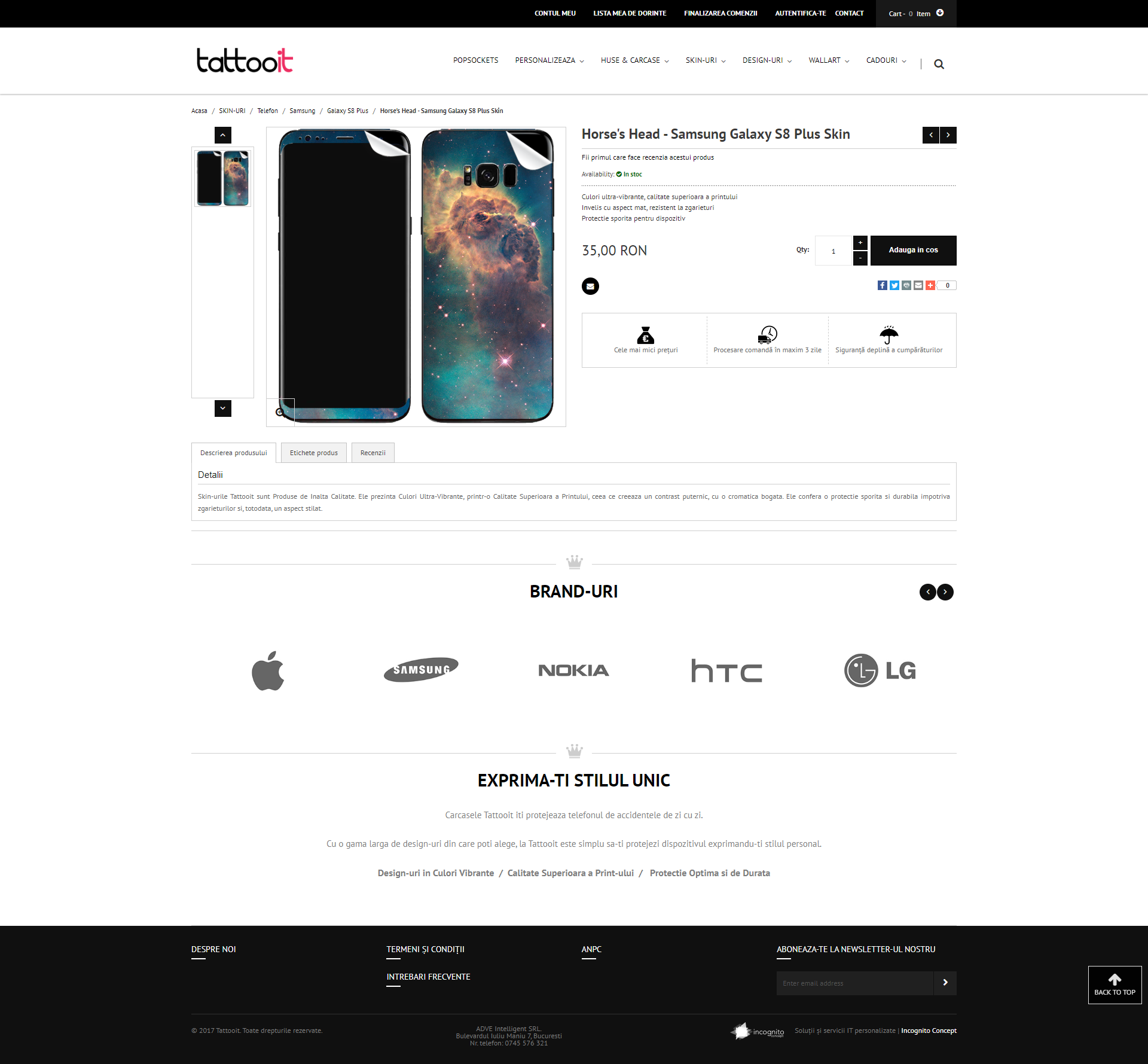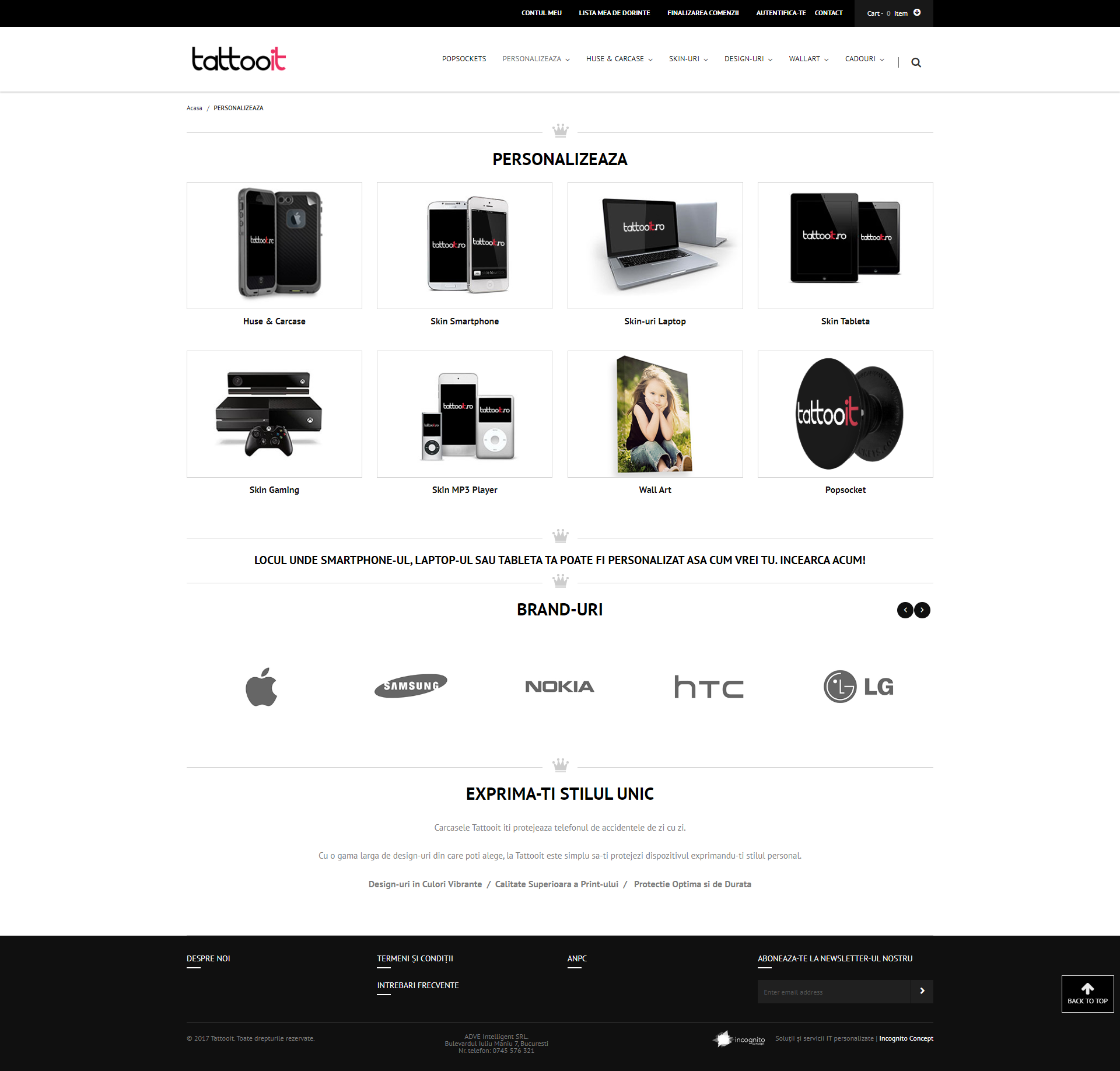 Tatooit este un brand al agentiei de publicitate adVE. Acesta este primul magazin online din Romania care produce si comercializeaza carcase, huse si skin-uri personalizate pentru telefoane, laptopuri, tablete, console de gaming si multe alte gadget-uri. Ofera servicii de personalizare pentru peste 3000 de dispozitive, inclusiv produse textile precum tricouri, bluze, hanorace, iar galeria acestora de imagini contine peste 1500 de modele grafice.